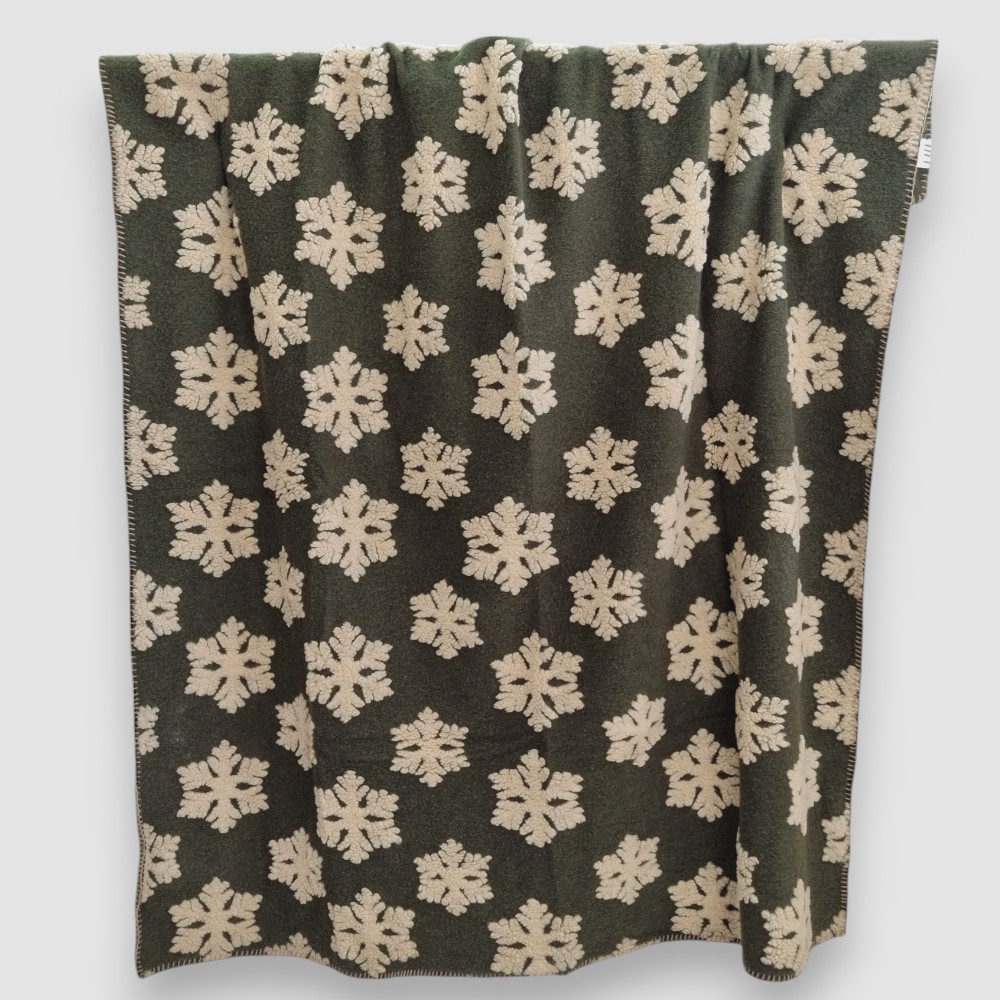Discover the boiled wool throw with a snowflake motif on a loden green background. Soft and warm, it measures 150 x 170 cm and is perfect for adding comfort and style to your living room or bedroom.